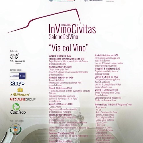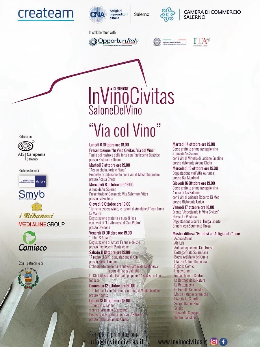 Le porte del tempio di Pomona sono pronte a spalancarsi, per accogliere la manifestazione più importante dedicata al vino promossa nella città di Salerno dall'associazione Createam in collaborazione con CNA Salerno e con la Camera di Commercio. Dalle 16 del 18 ottobre il via ufficiale ad In Vino Civitas, nella nuova location scelta per la nona edizione che offre la degustazione di oltre 500 etichette provenienti dalle aziende vitivinicole italiane più importanti.